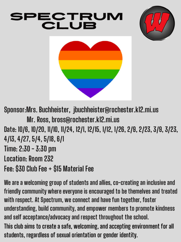 We are a welcoming group of students and allies, co-creating an inclusive and friendly community where everyone is encouraged to be themselves and treated with respect. At Spectrum, we connect and have fun together, foster understanding, build community, and empower members to promote kindness and self acceptance/advocacy and respect throughout the school. This club aims to create a safe, welcoming, and accepting environment for all students, regardless of sexual orientation or gender identity.