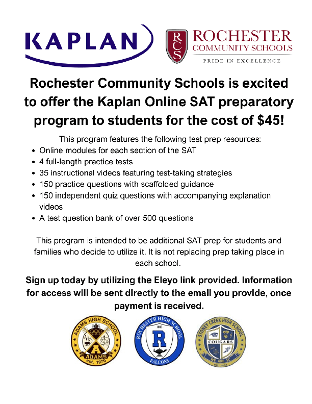 SAT preparatory program just for RCS students! This online program will help your student prepare for their SAT along with in school preparation. Online access is available for 6 months from time of activation.
